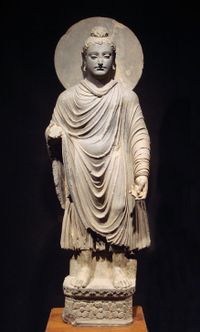 تمثال بوذا. واحد من أول التماثيل المعروفة لبوذا، القرن 1-2 ق.م، گندهارا (أفغانستان المعاصرة).