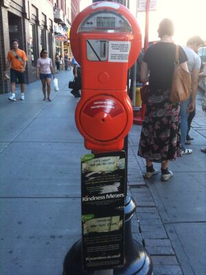 A kindness meter (below the red parking meter) in Ottawa, Ontario, Canada. The meter accepts donations for charitable efforts as part of an official effort to discourage panhandling.