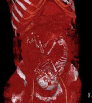 - إن المادة المظللة، عندما يتم إعطاؤها عن طريق الفم، غير ضارة.[1] يمكن أن تعبر المعالجة الوريدية لعوامل التباين الشعاعي باليود المشيمة ويدخل الدورة الدموية للجنين، لكن الدراسات على الحيوانات لم تبلغ عن أي تأثيرات ماسخة أو مطفرة من استخدامه. كانت هناك مخاوف نظرية حول الضرر المحتمل لليود الحر على الغدة الدرقية الجنينية،[1] ولكن أظهرت دراسات متعددة أن جرعة واحدة من وسط التباين المعالج باليود إلى الأم الحامل ليس لها تأثير على وظيفة الغدة الدرقية الوليدية.[2] ومع ذلك، يوصى عمومًا بعدم استخدام التباين الراديوي إلا إذا كان ذلك مطلوبًا تمامًا للحصول على معلومات تشخيصية إضافية من شأنها تحسين رعاية الجنين أو الأم.