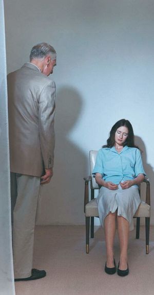 في صالة من العهد الڤيكتوري، رجل يرتدي صدرية ويؤرجِح ساعة جيبه جيئة وذهابا في وجه امرأة شابة جالسة أمامه وهي تشخص بناظريها محدِّقة بالساعة ومتابعة مسير حركتها النواسية. وما هي إلا لحظات حتى تخرّ مسترخية في كرسيِّها، وهي مغمضة العينين تجيب عن أسئلة المنوِّم المغنطيسي برتابة شديدة.