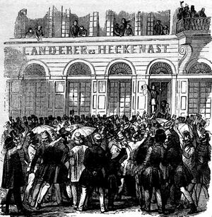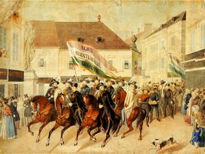 The arrival of the news of the revolution in Paris, and Kossuth's German speech about freedom and human rights had whipped up the passions of Austrian crowd in Vienna on March 13.[32] While the Viennese masses celebrated Kossuth as their hero, revolution broke out in Buda on 15 March; Kossuth traveled home immediately.[33]