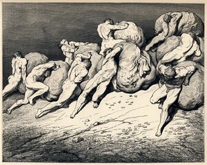 Relating this sin of incontinence to the two that preceded it (lust and gluttony), Dorothy L. Sayers writes, "Mutual indulgence has already declined into selfish appetite; now, that appetite becomes aware of the incompatible and equally selfish appetites of other people. Indifference becomes mutual antagonism, imaged here by the antagonism between hoarding and squandering."[53] The contrast between these two groups leads Virgil to discourse on the nature of Fortune, who raises nations to greatness and later plunges them into poverty, as she shifts, "those empty goods from nation unto nation, clan to clan".[54] This speech fills what would otherwise be a gap in the poem, since both groups are so absorbed in their activity that Virgil tells Dante that it would be pointless to try to speak to them – indeed, they have lost their individuality and been rendered "unrecognizable".[55]