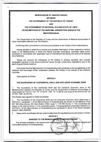 | مذكرة تفاهم بين حكومة الجمهورية لتركية وحكومة الوفاق الوطني- دولة ليبيا حول ترسيم الحدود البحرية في البحر المتوسط | |