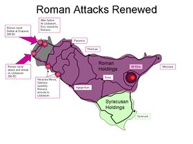 خريطة غرب البحر المتوسط، عام 264 ق.م. روما تظهر باللون الأحمر، وقرطاج باللون الرمادي، وسيراقوسة بالأخضر.  | |||||||||