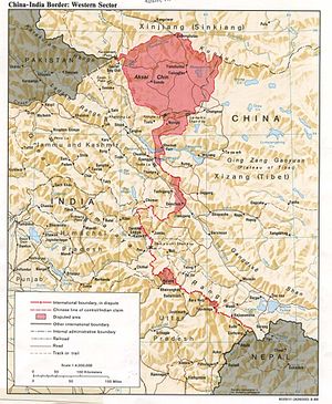 في ذلك الوقت، لم يدين المسئولون الصينيون مزاعم نهرو أو لم يعترضوا على إعلان نهرو الصريح بالسيطرة على آقصاي چن. عام 1956، صرح الوزير الأول الصيني ژو إنلاي أنه ليس لديه مطالبات بالأراضي الواقعة تحت السيطرة الهندية.[40] زعم لاحقاً أن آقصاي چن كانت بالفعل تحت الولاية الصينية وأن خط مكرتني-مكدونالد هو الخط الذي يمكن أن تقبل به الصين.[32][34] لاحقاً ادعى ژو أن الحدود لم ترسم وأنها لم تُحدد من خلال معاهدة بين أي من الحكومتين الصينية أو الهندية، ولا يمكن للحكومة الهندية ترسيم حدود آقصاي چن بطريقة أحادية.[30]