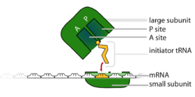 In prokaryotes, much work has been done to further identify the importance of rRNA in translation of mRNA. For example, it has been found that the A site consists primarily of 16S rRNA. Apart from various protein elements that interact with tRNA at this site, it is hypothesized that if these proteins were removed without altering ribosomal structure, the site would continue to function normally. In the P site, through the observation of crystal structures it has been shown the 3' end of 16s rRNA can fold into the site as if a molecule of mRNA. This results in intermolecular interactions that stabilize the subunits. Similarly, like the A site, the P site primarily contains rRNA with few proteins. The peptidyl transferase center, for example, is formed by nucleotides from the 23S rRNA subunit.[15] In fact, studies have shown that the peptidyl transferase center contains no proteins, and is entirely initiated by the presence of rRNA. Unlike the A and P sites, the E site contains more proteins. Because proteins are not essential for the functioning of the A and P sites, the E site molecular composition shows that it is perhaps evolved later. In primitive ribosomes, it is likely that tRNAs exited from the P site. Additionally, it has been shown that E-site tRNA bind with both the 16S and 23S rRNA subunits.[21]