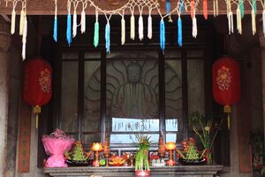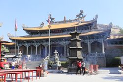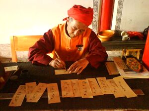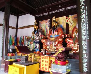 Many scholars see "north Chinese religion" as distinct from practices in the south.[119] The folk religion of southern and southeastern provinces is primarily focused on the lineages and their churches (zōngzú xiéhuì 宗族协会) and the worship of ancestor-gods. The folk religion of central-northern China (North China Plain), otherwise, is focused on the communal worship of tutelary deities of creation and nature as identity symbols, by villages populated by families of different surnames,[120] structured into "communities of the god(s)" (shénshè 神社, or huì 会, "association"),[121] which organise temple ceremonies (miaohui 庙会), involving processions and pilgrimages,[122] and led by indigenous ritual masters (fashi) who are often hereditary and linked to secular authority.[note 8] Northern and southern folk religions also have a different pantheon, of which the northern one is composed of more ancient gods of Chinese mythology.[123]