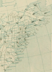 Surface analysis of Great Blizzard of 1888. Areas with greater isobaric packing indicate higher winds.