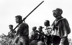 رجال السامواري السبعة (1954 م): وتظهر شخصيات كامبيي (تاكاشي شيمورا) و كيكتشيرو (توشيرو ميفوني) في مقدمة الصورة.