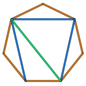 A heptagonal triangle has vertices coinciding with the first, second, and fourth vertices of a regular heptagon (from an arbitrary starting vertex) and angles and Thus its sides coincide with one side and two particular diagonals of the regular heptagon.[6]