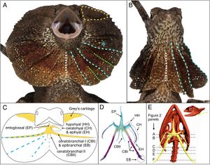 The distinctive frill is a flap of skin that extends from the head and neck and contains several folded ridges. When fully extended, the frill is disc-shaped and can reach over four times the length of the animal's torso in diameter. Otherwise it wraps around the body.[14][15] The frill is laterally symmetrical; the right and left sides are attached at the bottom in a V-shape, and cartilage-like connective tissue (Grey's cartilage) connects the top ends to each side of the head near the ear openings.[12][14] The frill is supported by rod-like hyoid bones, and is spread out by movements of these bones, the lower jaw and Grey's cartilage.[14] This structure mainly functions as a threat display to predators and for communication between individuals. It can also act as camouflage when folded, but this is unlikely to have been a consequence of selection pressure.[15] The frill may be capable of working like a directional microphone, allowing them to better hear sounds directly in front of them but not around them.[16] There is no evidence for other suggested functions, such as food storage, gliding or temperature regulation.[15]