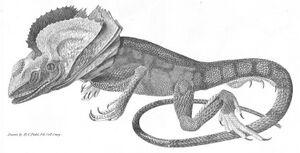 The frilled lizard is considered to be among the most iconic Australian animals along with the kangaroo and koala.[10] Archaeological evidence indicates that frilled lizards were eaten by some indigenous peoples in ancient times.[33] In the late 19th century, William Saville-Kent brought a live lizard to England where it was observed by fellow biologists. Another specimen was kept at a reptile display in Paris, as reptiles were becoming more popular in captivity.[2]