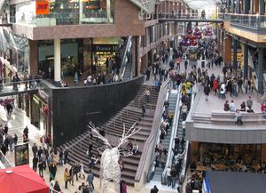 سلالم متحركة في مركز تسوق كابوت سيركس، بريستول، إنگلترة، يوفر بديلاً للسلم المجاور.