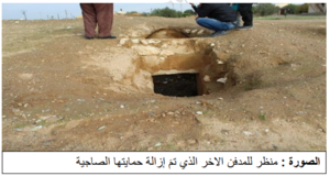 تم التعدي من قبل الفصائل المسلحة عن طريق اسـتئجار عمال من أجل الحفر والبحث عن الأثار بشكل عشوائي ، ومما يـؤكد ذلك كثرة انتشــار الحفر على كامل الموقع ، بالإضافة الى حفر موقع في الطرف الشرقي من قبل داعش بالآليات الثقيلة ،ممـا أدى إلى تخريب لوحة فسيفســاء فــي المكان أبعادها (2م/2م) ، وذلك حســب شــهادة أهالي المنطقة ، وكذلك تعدي الأهالي وخاصة من الطرف الغربي ، بالزراعــة والبنــاء . أمــا المــدافن فهي بدورها لم تســلم من تلك التجاوزات والتعديـات ، حيث تم إزالة الحماية الصاجية التي كانت منفذة من قبل متحف الرقة ، وتحويل المدفن إلى مكب لنفايات للأهالي .[1]