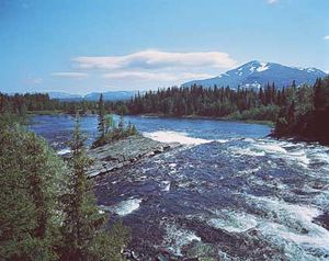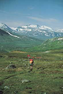 رياضة المشي رياضة لها شعبيتها بين السويديين. والبرية السويدية الشمالية تمثل تحديًا مثيرًا للمشاة. في (الصورة أعلاه) رياضي يشق طريقه إلى شمال الدائرة القطبية.