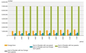 9. ^ Note that Swedish-speaking Finns or other Swedish-speakers born outside Sweden might identify as Swedish despite being born abroad. Moreover, people born in Sweden may not be ethnic Swedes. As the Swedish government does not base any statistics on ethnicity, there are no exact numbers on the ethnic background of migrants and their descendants in Sweden. This is not, however, to be confused with migrants' national backgrounds, which are recorded.