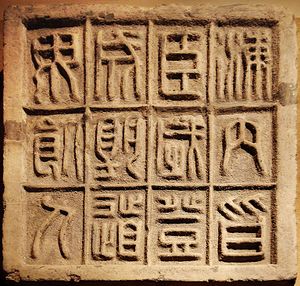 The 12 characters on this slab of floor brick affirm that it is an auspicious moment for the First Emperor to ascend the throne, as the country is united and no men will be dying along the road.