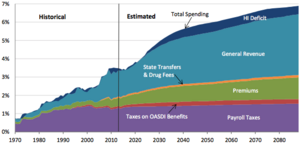 An aging population has implications for social-welfare programs.[5] The U.S. federal social security system functions through collecting payroll taxes to support older citizens.[84] It is possible that a smaller workforce, coupled with increased numbers of longer-living elderly, may have a negative impact on the social security system. The Social Security Administration (SSA) estimates that the dependency ratio (people ages 65+ divided by people ages 20–64) in 2080 will be over 40%, compared to the 20% in 2005.[84] SSA data shows one out of every four 65-year-olds today will live past the age of 90, while one out of 10 will live past 95. Indeed, 60% of baby boomers are more worried about outliving their savings than dying.[145] Rising life expectancy may result in reductions in social security benefits, devaluing private and public pension programs.[84][146] Were there to be a reduction or elimination of programs such as social security and Medicare, many may need delay retirement and to continue working.[142] In 2018, 29% of Americans aged 65–72 remained active in the labor force, according to the Pew Research Center, as Americans generally expect to continue to work after turning 65. The baby boomers who chose to remain in the work force after the age of 65 tended to be university graduates, whites, and urban residents. That the boomers maintained a relatively high labor participation rate made economic sense because the longer they postpone retirement, the more Social Security benefits they could claim, once they finally retire.[147] However, given current trends (2023), U.S. federal expenditure on programs for the elderly will equal spending on education, research and development, transportation, and national defense combined by 2033. This compounds the problem of soaring public debt.[148]