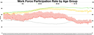 From a demographic point of view, the labor shortage in the United States during the 2020s is inevitable due to the sheer size of the aging Baby Boomers.[91][92] As the oldest economically active cohort,[92] the Baby Boomers comprised about a quarter of the U.S. workforce in 2018.[93] Though they were projected by economists to begin retiring in the 2010s,[91] 29% of older Baby Boomers (65–72 years of age) in the United States remained active in the labor force in 2018, a large portion compared to older cohorts at the same age.[94] Employment rates among workers aged 65 and over are increasing since the 1990s,[95][13] and, indeed, the share of people who continue working after turning 65 is relatively high in the US, when compared to other developed countries.[96] Seniors who choose to remain in the workforce tend to be highly educated and high-income earners. At the same time, technological innovations have made work more convenient, safer, and less physically demanding for (older) workers.[13] In any case, the official age of retirement in the United States had already been raised, and Baby boomers were incentivized to postpone retirement in part because it allowed them to claim more Social Security benefits once they finally retired.[94] Furthermore, large numbers would like semi-retirement arrangements or flexible work schedules.[97] There is an ongoing shift away from pension plans in favor of 401(k) or similar options, which do not mandate retirement at a certain age.[13]