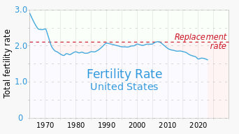 Women's workforce participation has grown as the nation's birthrate declines, opening up more opportunities for them.[21] But American women continue to have more children on average than their counterparts in other industrialized nations despite the fact that the United States does not offer generous welfare programs by comparison.[6] Given the experience of other countries, pro-natalist policies such as paid maternity leave are unlikely to significantly increase the birthrate in the United States.[22][23] As the youth bulge fades away after the 2020s, the United States will be less prone to sociopolitical instability.[24]