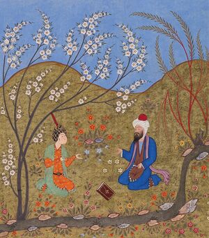 منمنمة فارسية تصور الصوفي في العصور الوسطى أحمد الغزالي (ت 1123) ، شقيق أبو حامد الغزالي الصوفي الشهير (المتوفي 1111) ، يتحدث إلى تلميذ، من لقاءات العشاق (1552)