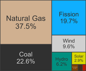 Fossil fuels made up the majority of generation, with natural gas providing 38% and coal 23%. Petroleum provided less than 1%. Natural gas as a proportion of fossil fuels has been increasing since the 90's, with coal peaking around 2008 and natural gas becoming the top fossil fuel in 2016.[12]