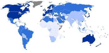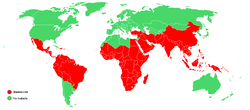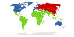 العوالم الثلاثة كما انفصلوا أثناء فترة الحرب الباردة، كل منهم له حلفاؤه، كما بدوا في الفترة بين 30 أبريل 1975 (سقوط سايگون) و 23 أغسطس 1975 (استيلاء الشيوعيين على لاوس). الألوان لا تمثل التنمية الاقتصادية الحالية.