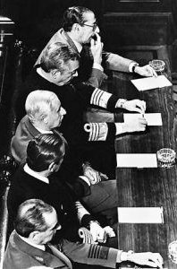 احدى جلسات محاكمات نورمبرگ التي عقدت لمقاضاة قادة ألمانيا لأعمالهم العدوانية أثناء الحرب العالمية الثانية. أولى مراحل تطبيق العدالة الانتقالية.