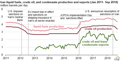 في أبريل 2019، هددت الولايات المتحدة بفرض عقوبات على البلدان التي ستواصل بيع النفط من إيران بعد انتهاء مهلة مدتها ستة أشهر انتهت في نوفمبر.[33]