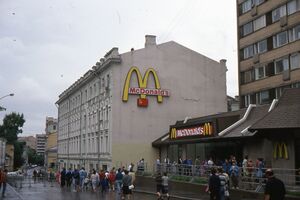 In July 1991, Bush and Gorbachev signed the Strategic Arms Reduction Treaty (START I) treaty, the first major arms agreement since the 1987 Intermediate Ranged Nuclear Forces Treaty.[131] Both countries agreed to cut their strategic nuclear weapons by 30 percent, and the Soviet Union promised to reduce its intercontinental ballistic missile force by 50 percent.[132] Along with this, American businesses started to enter the liberalized Soviet economy, leading to famous U.S. companies opening their stores in Russia. Perhaps, the most famous example is McDonald's, who first restaurant in Moscow led to cultural shock on behalf of bewildered Soviet citizens, who stood in huge lines to buy American fast food.[133] The first McDonald's in the country had a grand opening on Moscow's Pushkin Square on 31 January 1990 with approximately 38,000 customers waiting in hours long lines, breaking company records at the time.[134] In August 1991, hard-line conservative Communists launched a coup attempt against Gorbachev; while the coup quickly fell apart, it broke the remaining power of Gorbachev and the central Soviet government.[135] Later that month, Gorbachev resigned as general secretary of the Communist party, and Russian President Boris Yeltsin ordered the seizure of Soviet property. Gorbachev clung to power as the President of the Soviet Union until 25 December 1991, when the USSR dissolved.[136] Fifteen states emerged from the Soviet Union, with by far the largest and most populous one (which also was the founder of the Soviet state with the October Revolution in Petrograd), the Russian Federation, taking full responsibility for all the rights and obligations of the USSR under the Charter of the United Nations, including the financial obligations. As such, Russia assumed the Soviet Union's UN membership and permanent membership on the Security Council, nuclear stockpile and the control over the armed forces; Soviet embassies abroad became Russian embassies.[137] Bush and Yeltsin met in February 1992, declaring a new era of "friendship and partnership".[138] In January 1993, Bush and Yeltsin agreed to START II, which provided for further nuclear arms reductions on top of the original START treaty.[139]