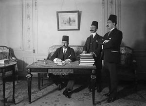 صورة من داخل مقر سفارة المملكة المصرية في فرنسا سنة 1924 سعادة السفير محمود حسين فكري باشا ومساعديه***