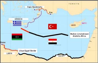 وعلى الجانب الآخر فإن اللجنة العليا لأعالى البحار التى تضم فى عضويتها عدداً من الجهات السيادية، منها وزارتا الدفاع والخارجية، أن الحكومة بريئة من تهم التفريط فى حقوق مصر الاقتصادية فى البحر المتوسط، كما تكشفان عن محاولات تركيا إقناع الحكومة المصرية خلال حكم الرئيس محمد مرسي لإعادة رسم حدودها البحرية طبقاً لتصوراتها التى تخالف القانون الدولى، أملاً منها فى تعظيم ثرواتها البحرية المحدودة من غاز المتوسط على حساب دول الجوار وتحديداً قبرص ومصر، وهو ما تصدت له وزارة الدفاع المصرية فى مارس 2012 لعدم قانونيته من ناحية، ولأنه يلحق بمصالحنا الاقتصادية والأمنية أضراراً بالغة. وتوضح الخريطة الواردة أعلاه مقترح تركيا لترسيم الحدود البحرية مع اليونان، وهو المقترح الذى تقدمت به أنقرة للحكومة المصرية خلال عهد الرئيس الأسبق محمد مرسى وحكومة الدكتور هشام قنديل، وتحديداً فى مارس 2012 ورفضته وزارة الدفاع المصرية واللجنة العليا لأعالى البحار، وقال مصدر مطلع إن وزارة الدفاع التى كان يتولاها وقتها الفريق أول عبد الفتاح السيسي، رفضت المقترح التركى لأنها رأت فيه تعدياً صارخاً على مناطق الامتياز الخاصة بمصر، حيث ينص على امتداد حدود تركيا إلى داخل حدود اليونان بنحو 50 كيلومتراً، ويعتدى على مناطق الامتياز المصرية بنحو 70 كيلومتراً، بالإضافة إلى استيلائها على 274 كيلومتراً من حدود قبرص داخل المتوسط، ووفقاً للمصدر سارعت وزارة الدفاع وقتها، حرصاً منها على حقوق مصر، بإرسال الخريطة الأصلية التى توافق صحيح نصوص قانون البحار الدولى لوزارة البترول، حتى تكون المرجع الذى تستند إليه الوزارة فى طرح المزايدات البترولية طبقاً للنقاط الحدودية الرئيسية المتفق عليها مع الدول المجاورة والمتقابلة.