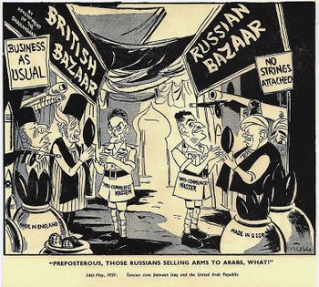 كرتون من مايو 1959، عن توتر العلاقات بين جمال عبد الناصر وعبد الكريم قاسم.