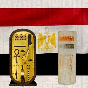 التاج باللون الإسود (كم) بيعبر عن طمي النيل رمز رخاء و خصوبة مصر اللي اتسمت على اسمه (كمت)