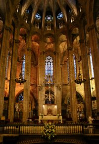 حمل رهبان فرنسا في القرن الثاني عشر الطراز القوطي إلى أسبانيا فوق جبال البرانس، كما نقلوا طراز العمارة الرومنسي إلى تلك البلاد في القرن الحادي عشر. وكانت كثدرائية سان سلفادور القائمة في بلدة أفيلا الصغيرة (1091 وما بعدها) هي بداية الانتقال من الطراز الرومنسي إلى القوطي، وذلك بما احتوته من العقود المستديرة، والباب القوطي الطراز، والعمد الشيقة التي في القبا والتي ترتفع حتى تتصل بالأضلاع المستدقة في القبة. واحتفظ أهل سلمنقة Salamanca الأتقياء الكثدرائية القديمة التي تمثل دور الانتقال والتي شيدت في القرن الثاني عشر إلى جانب الكثدرائية الجديدة التي شيدوها في القرن السادس عشر، وتكون الكنيستان معا مجموعة من أكبر المجموعات البنائية وأعظمها روعة في أسبانيا. وفي طراجونة Taragona كانت الصعاب المالية سبباً في إطالة عملية بناء الكرسي الكهنوّتي من 1089 إلى 1375، وإن ما يتصف به البناء من بساطة ومتانة ليوائم الزخارف القوطية والإسلامية، وما فيه من الأروقة- المكونة من عمد رومنسية تحت قبة قوطية- لمن أجمل ما أخرجه فن القصور الوسطى.
