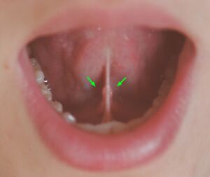 Sublingual caruncles highlighted on either side of the frenulum