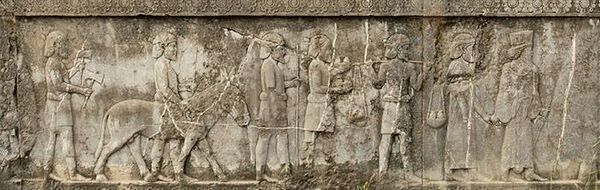 The reliefs at the Apadana Palace in Persepolis describe tribute bearers from 23 satrapies visiting the Achaemenid court. These are located at the southern end of the Apadana Staircase. Among the foreigners the Arabs, the Thracians, the Bactrians, the Indians (from the Indus valley area), the Parthians, the Cappadocians, the Elamites or the Medians. The Indians from the Indus valley are bare-chested, except for their leader, and barefooted and wear the dhoti. They bring baskets with vases inside, carry axes, and drive along a donkey.[64] One man in the Indian procession carries a small but visibly heavy load of four jars on a yoke, suggesting that he was carrying some of the gold dust paid by the Indians as tribute to the Achaemenid court.[63]