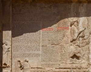 The Naqsh-e Rustam DNa inscription, on the tomb of Darius I, mentioning all three Indian territories: Sattagydia (𐎰𐎫𐎦𐎢𐏁, Thataguš), Gandara (𐎥𐎭𐎠𐎼, Gadāra) and India (𐏃𐎡𐎯𐎢𐏁, Hidūš) as part of the Achaemenid Empire.[38]