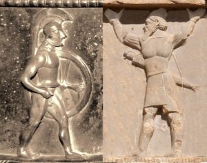 Greek Ionian (Yavanas), Scythian (Sakas) and Persian (Parasikas) soldiers of the Achaemenid army, as described on Achaemenid royal tombs from circa 500 to 338 BCE.