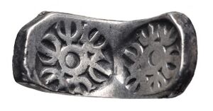 105. ^ "the local coins of the Achaemenid era (...) were the precursors of the bent and punch-marked bars" in Bopearachchi, Osmund. Coin Production and Circulation in Central Asia and North-West India (Before and after Alexander's Conquest) (in الإنجليزية). p. 311.