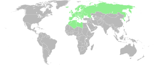 - Northwestern Asia: Arkhangelsk Oblast including Nenets Autonomous Okrug and Novaya Zemlya, Astrakhan Oblast, Bashkortostan, Belgorod Oblast, Bryansk Oblast, Chuvashia, Lipetsk Oblast, Kaliningrad Oblast, Kaluga Oblast, Novgorod Oblast, Republic of Karelia, Kirov Oblast, Komi Republic, Kursk Oblast, Mordovia, Murmansk Oblast, Orenburg Oblast, Penza Oblast, Perm Krai, Pskov Oblast, Rostov Oblast, Ryazan Oblast, Saint Petersburg, Samara Oblast, Saratov Oblast, Tambov Oblast, Tatarstan, Tula Oblast, Udmurtia, Volgograd Oblast, Vologda Oblast, Voronezh Oblast,