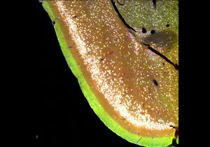 | القشرة الكمثرية لفأر عمرن 14 يوماً (بالأخضر) stained for enkephalin (بالأحمر) and DAPI (بالأزرق) to show nuclei. Epifluorescence. | ||