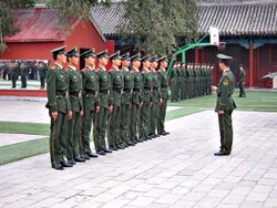 The current system of other ranks and insignia dates from 2009.[23] Sergeant and Corporal are referred to as non-commissioned officers. New recruits have no military ranks before the boot camp is completed, and they will be awarded the rank of private after they have graduated from the induction training.[24] According to Article 16 of Chapter 3 of the "Regulations on the Service of Active Soldiers of the Chinese People's Liberation Army" (الصينية: 中国人民解放军现役士兵服役条例), "The lowest enlisted rank is Private".[24]