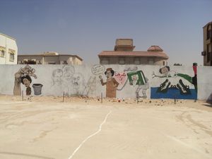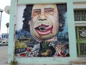 وقد تحولت الثورة في ليبيا إلى صراع مسلح وحرب أهلية. وانتهت تلك الحرب بأسر الزعيم الليبي معمر القذافي، وقتله في 20 أكتوبر 2011.[1] وقد زين الهجاء والسخرية الفنية من الزعيم الليبي سيئ السمعة شوارع ليبيا وجدرانها وأرضيتها.