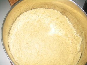 وبعد فترة يتحول السميد إلى حبيبات صغيرة وبحركات بارعة من اليدين تنفصل الحبيبات ولا تلتصق ونستمر في العملية حتى تتحول الكمية كلها إلى حبيبات، بعدها يمرر خلال غربال خاص بصناعة الكسكسي - غربال واسع الثقوب، تم يضاف قليل من الزيت حتى لا يتعجن أثناء الطهى.