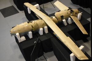 The HESA Shahed 136, or simply Shahed 136,[28] known also as the Geran-2 (روسية: Герань-2) in Russian service, is a loitering munition in the form of an autonomous pusher-prop UCAV.[29] It is designed and manufactured by Iran Aircraft Manufacturing Industrial Company, or HESA, in association with Shahed Aviation Industries.[30] Its first appearance was 13 September 2022, when photos of the remains of a drone used by Russian forces during the invasion of Ukraine were publicly released.[28] The wings were inscribed with "M412 Герань-2" ("M412 Geran-2" in Russian) as a means of disguising the drone and concealing Iran's part in the invasion of Ukraine,[2] but it was recognized by its wing design, and Geran-2 drones are considered by Ukraine and its Western allies to be redesignated Iranian-made Shahed 136 drones.[28][31][32] Experts have estimated a Shahed 136 costs between US$20٬000 to US$50٬000 to make.[33][6] A series of leaked emails and documents revealed Russia had purchased 6,000 Shahed 136s for US$193٬000 each in 2023.[6]