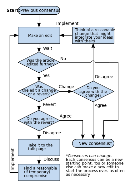 While the consensus process does not require posting to the discussion page, it can be useful. Edit summaries are short and can be misinterpreted. Discussing your edit may help it attract consensus. Posting a comment before editing is the best way to avoid misunderstandings. If you are unsure about an edit someone has made, wait a reasonable amount of time to allow them to post a comment. Also, when considering edits, be sure to check the discussion page to see if there are any open or closed discussions on the area you were about to edit. But once you have checked and contributed to the discussion, don't be too timid, BE BOLD.