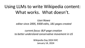 Specifically, asking an LLM to "write a Wikipedia article" can sometimes cause the output to be outright fabrication, complete with fictitious references. It may be biased, may libel living people, or may violate copyrights. Thus, all text generated by LLMs should be verified by editors before use in articles.