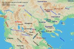 Thucydides's account gives a geographical overview of Macedonian possessions at the time of Alexander I's rule. To reconstruct a chronology of the expansion by Alexander I's predecessors is more difficult, but generally, three stages have been proposed from Thucydides' reading. The initial and most important conquest was of Pieria and Bottiaea, including the locations of Pydna and Dium. The second stage consolidated rule in Pieria and Bottiaea, captured Methone and Pella, and extended rule over Eordaea and Almopia. According to Hammond, the third stage occurred after 550 BC, when the Macedonians gained control over Mygdonia, Edonis, lower Paeonia, Bisaltia and Crestonia.[44] However, the second stage might have occurred as late as 520 BC;[45] and the third stage probably did not occur until after 479 BC, when the Macedonians capitalized on the weakened Paeonian state after the Achaemenid Empire withdrawal from Macedon and the rest of their mainland European territories.[46] Whatever the case, Thucydides' account of the Macedonian state describes its accumulated territorial extent by the rule of Perdiccas II, Alexander I's son. Hammond has said that the early stages of Macedonian expansion were militaristic, subduing or expunging populations from a large and varied area.[47] It has been hypothesized that the cause of Macedonian expansion was demographic pressure. Because pastoralism and highland living could not support a very concentrated settlement density, pastoralist tribes often searched for more arable lowlands suitable for agriculture.[48]