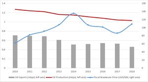 وتوقع المعهد أن يبلغ هذا الاحتياطي 44 مليار دولار بحلول نهاية عام 2020، متابعًا بذلك المنحى الانحداري الذي اتّخذه منذ عام 2014 عندما بلغ 195 مليار دولار، وتبعًا لأحدث توقّعات صندوق النقد الدولي، من المتوقّع أن يتقلّص الاقتصاد بنسبة 5.5%.[14]
